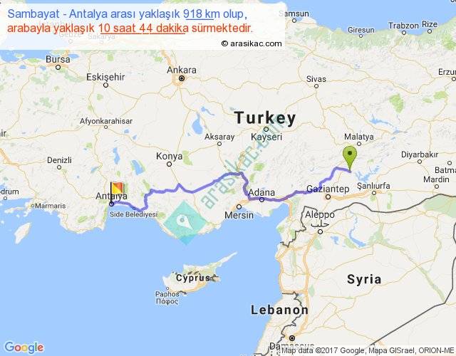 Sambayat - Antalya arası yaklaşık olarak 90 km/h ile yukarıda belirtilen sürede olup, iki yerin kuş uçuşu uzaklığı (mesafesi) 652'dir. Eğer belirtilen yerler arasında uçak seferi var ise bu süre uçakla 1 saat 00 dakika'ya kadar düşebilir. Yolculuk otobüsle 13 saat 57 dakika sürmektedir.