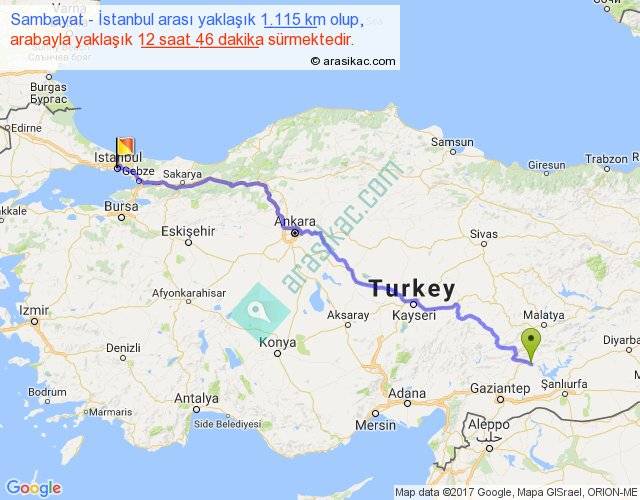 Sambayat - İstanbul arası yaklaşık olarak 90 km/h ile yukarıda belirtilen sürede olup, iki yerin kuş uçuşu uzaklığı (mesafesi) 858'dir. Eğer belirtilen yerler arasında uçak seferi var ise bu süre uçakla 1 saat 19 dakika'ya kadar düşebilir. Yolculuk otobüsle 16 saat 35 dakika sürmektedir.