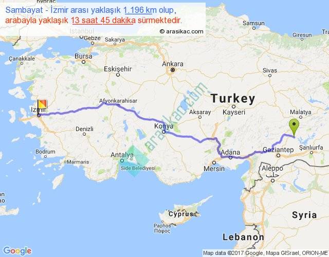 Sambayat - İzmir arası yaklaşık olarak 90 km/h ile yukarıda belirtilen sürede olup, iki yerin kuş uçuşu uzaklığı (mesafesi) 953'dir. Eğer belirtilen yerler arasında uçak seferi var ise bu süre uçakla 1 saat 27 dakika'ya kadar düşebilir. Yolculuk otobüsle 17 saat 52 dakika sürmektedir.