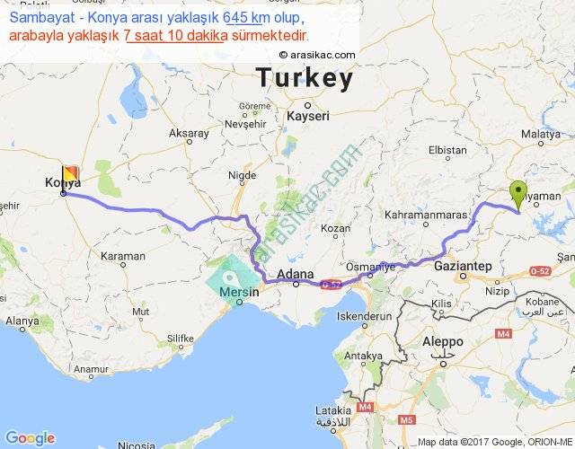 Sambayat - Konya arası yaklaşık olarak 90 km/h ile yukarıda belirtilen sürede olup, iki yerin kuş uçuşu uzaklığı (mesafesi) 487'dir. Eğer belirtilen yerler arasında uçak seferi var ise bu süre uçakla 44 dakika'ya kadar düşebilir. Yolculuk otobüsle 9 saat 19 dakika sürmektedir.