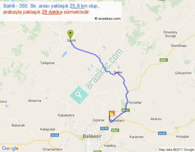 Samli - 350. Sk. arası yaklaşık olarak 90 km/h ile yukarıda belirtilen sürede olup, iki yerin kuş uçuşu uzaklığı (mesafesi) 17'dir. Yolculuk otobüsle 36 dakika sürmektedir.