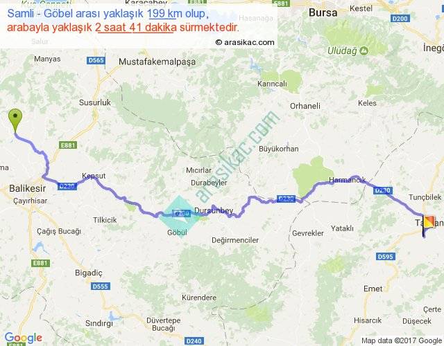 Samli - Göbel arası yaklaşık olarak 90 km/h ile yukarıda belirtilen sürede olup, iki yerin kuş uçuşu uzaklığı (mesafesi) 142'dir. Yolculuk otobüsle 3 saat 29 dakika sürmektedir.