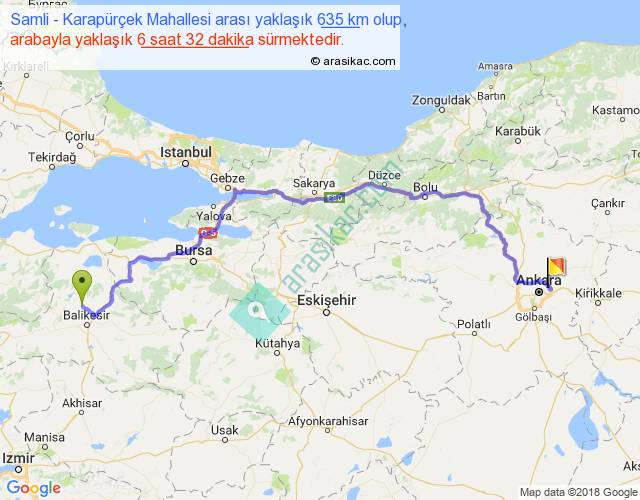 Samli - Karapürçek Mahallesi arası yaklaşık olarak 90 km/h ile yukarıda belirtilen sürede olup, iki yerin kuş uçuşu uzaklığı (mesafesi) 435'dir. Eğer belirtilen yerler arasında uçak seferi var ise bu süre uçakla 40 dakika'ya kadar düşebilir. Yolculuk otobüsle 8 saat 29 dakika sürmektedir.