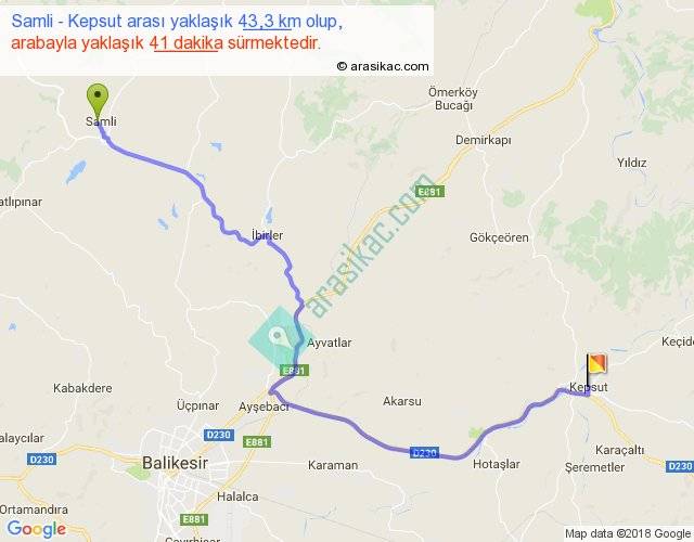 Samli - Kepsut arası yaklaşık olarak 90 km/h ile yukarıda belirtilen sürede olup, iki yerin kuş uçuşu uzaklığı (mesafesi) 30'dir. Yolculuk otobüsle 53 dakika sürmektedir.