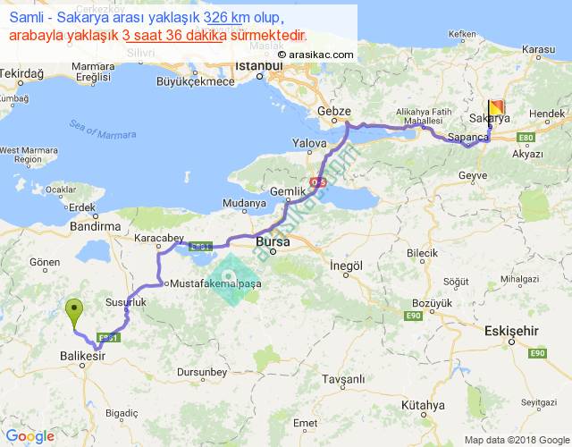 Samli - Sakarya arası yaklaşık olarak 90 km/h ile yukarıda belirtilen sürede olup, iki yerin kuş uçuşu uzaklığı (mesafesi) 240'dir. Yolculuk otobüsle 4 saat 40 dakika sürmektedir.