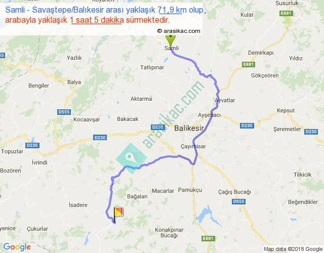Samli - Savaştepe Balıkesir arası yaklaşık olarak 90 km/h ile yukarıda belirtilen sürede olup, iki yerin kuş uçuşu uzaklığı (mesafesi) 42'dir. Yolculuk otobüsle 1 saat 24 dakika sürmektedir.