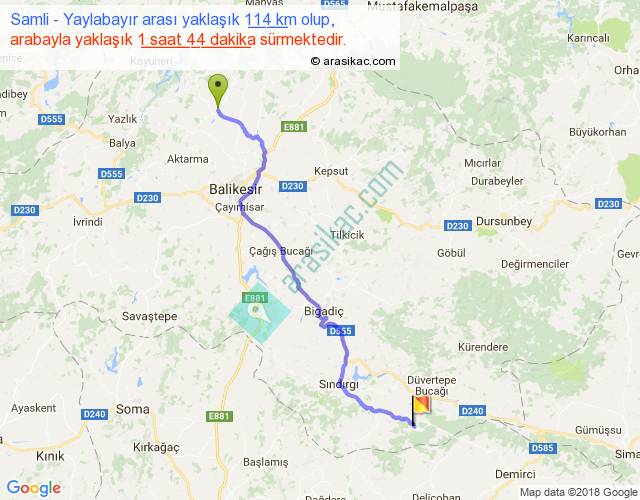 Samli - Yaylabayır arası yaklaşık olarak 90 km/h ile yukarıda belirtilen sürede olup, iki yerin kuş uçuşu uzaklığı (mesafesi) 87'dir. Yolculuk otobüsle 2 saat 15 dakika sürmektedir.