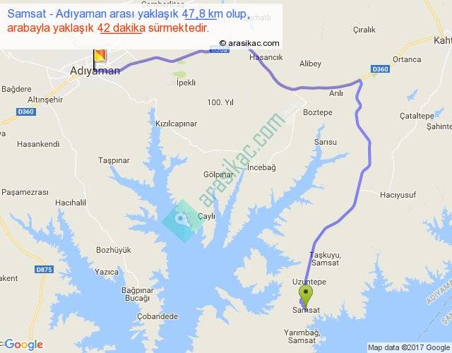 Samsat - Adıyaman arası yaklaşık olarak 90 km/h ile yukarıda belirtilen sürede olup, iki yerin kuş uçuşu uzaklığı (mesafesi) 27'dir. Yolculuk otobüsle 52 dakika sürmektedir.