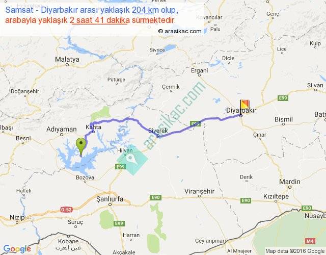 Samsat - Diyarbakır arası yaklaşık olarak 90 km/h ile yukarıda belirtilen sürede olup, iki yerin kuş uçuşu uzaklığı (mesafesi) 156'dir. Yolculuk otobüsle 3 saat 29 dakika sürmektedir.