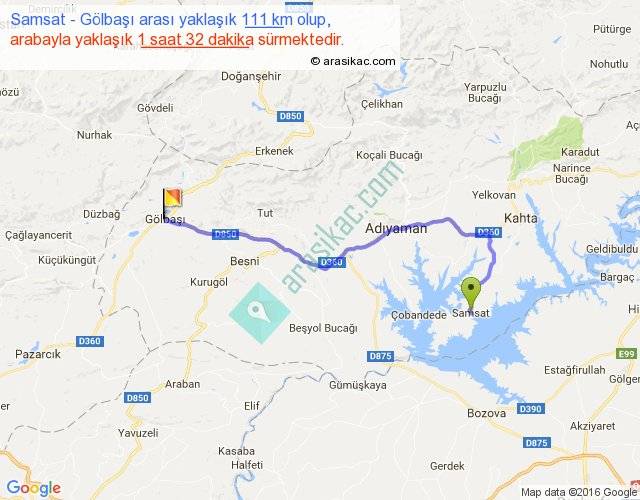 Samsat - Gölbaşı arası yaklaşık olarak 90 km/h ile yukarıda belirtilen sürede olup, iki yerin kuş uçuşu uzaklığı (mesafesi) 77'dir. Yolculuk otobüsle 1 saat 59 dakika sürmektedir.