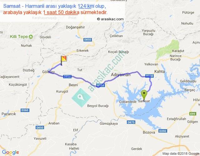 Samsat - Harmanli arası yaklaşık olarak 90 km/h ile yukarıda belirtilen sürede olup, iki yerin kuş uçuşu uzaklığı (mesafesi) 69'dir. Yolculuk otobüsle 2 saat 23 dakika sürmektedir.