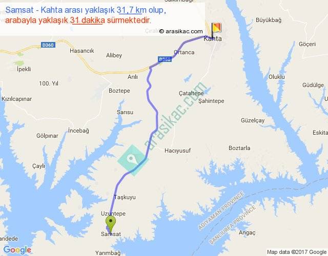 Samsat - Kahta arası yaklaşık olarak 90 km/h ile yukarıda belirtilen sürede olup, iki yerin kuş uçuşu uzaklığı (mesafesi) 26'dir. Yolculuk otobüsle 39 dakika sürmektedir.