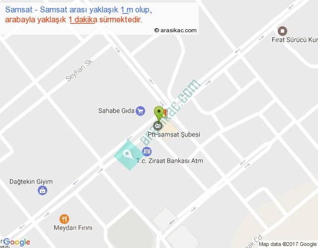 Samsat - Samsat arası yaklaşık olarak 90 km/h ile yukarıda belirtilen sürede olup, iki yerin kuş uçuşu uzaklığı (mesafesi) 0'dir. Yolculuk otobüsle 1 dakika sürmektedir.