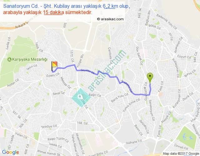 Eğer Sanatoryum Cd. Şht. Kubilay arası ne kadar yakar (benzin/mazot) diyorsanız, kilometrede 3 ₺ yakan bir aracınız var ise 18, km'de 4 ₺ yakan bir aracınız var ise 24, km'de 5 ₺ yakan bir aracınız var ise 30 ile bu yolculuğu tamamlayabilirsiniz.