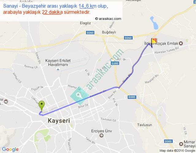 Sanayi - Beyazşehir arası yaklaşık olarak 90 km/h ile yukarıda belirtilen sürede olup, iki yerin kuş uçuşu uzaklığı (mesafesi) 12'dir. Yolculuk otobüsle 28 dakika sürmektedir.