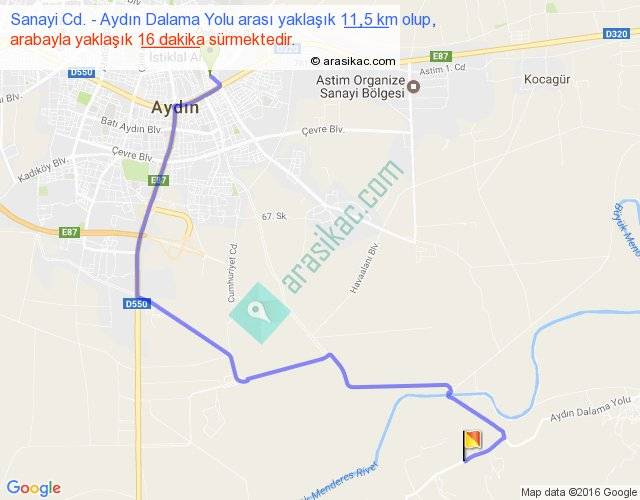 Sanayi Cd. - Aydın Dalama Yolu arası yaklaşık olarak 90 km/h ile yukarıda belirtilen sürede olup, iki yerin kuş uçuşu uzaklığı (mesafesi) 7'dir. Yolculuk otobüsle 20 dakika sürmektedir.