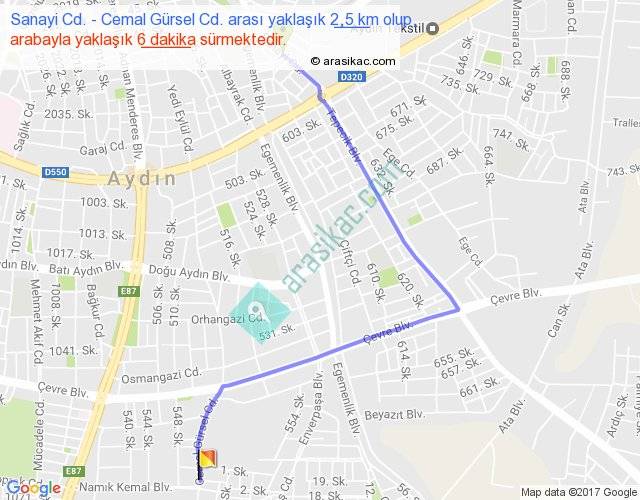 Sanayi Cd. - Cemal Gürsel Cd. arası yaklaşık olarak 90 km/h ile yukarıda belirtilen sürede olup, iki yerin kuş uçuşu uzaklığı (mesafesi) 2'dir. Yolculuk otobüsle 7 dakika sürmektedir.