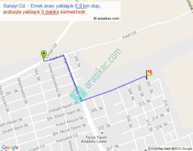 Sanayi Cd. - Emek arası yaklaşık olarak 90 km/h ile yukarıda belirtilen sürede olup, iki yerin kuş uçuşu uzaklığı (mesafesi) 1'dir. Yolculuk otobüsle 3 dakika sürmektedir.