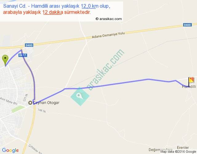 Sanayi Cd. - Hamdilli arası yaklaşık olarak 90 km/h ile yukarıda belirtilen sürede olup, iki yerin kuş uçuşu uzaklığı (mesafesi) 9'dir. Yolculuk otobüsle 15 dakika sürmektedir.