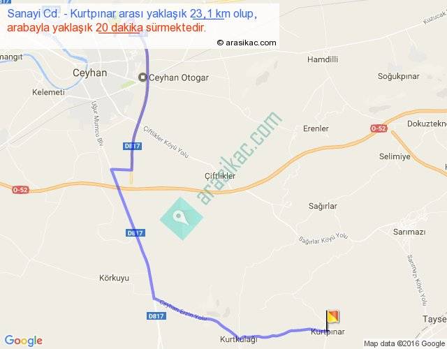 Sanayi Cd. - Kurtpınar arası yaklaşık olarak 90 km/h ile yukarıda belirtilen sürede olup, iki yerin kuş uçuşu uzaklığı (mesafesi) 16'dir. Yolculuk otobüsle 26 dakika sürmektedir.