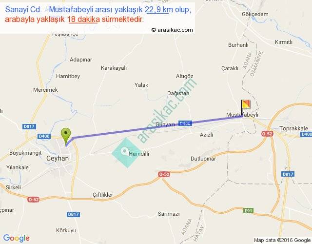 Sanayi Cd. - Mustafabeyli arası yaklaşık olarak 90 km/h ile yukarıda belirtilen sürede olup, iki yerin kuş uçuşu uzaklığı (mesafesi) 22'dir. Yolculuk otobüsle 23 dakika sürmektedir.