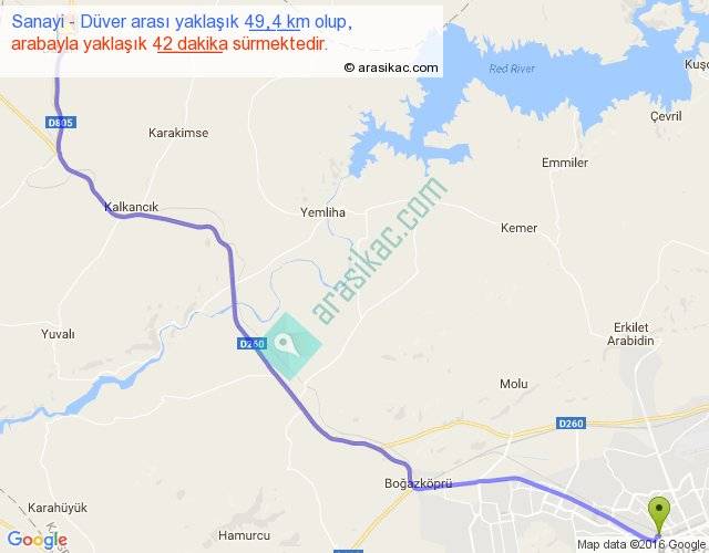 Sanayi - Düver arası yaklaşık olarak 90 km/h ile yukarıda belirtilen sürede olup, iki yerin kuş uçuşu uzaklığı (mesafesi) 41'dir. Yolculuk otobüsle 54 dakika sürmektedir.