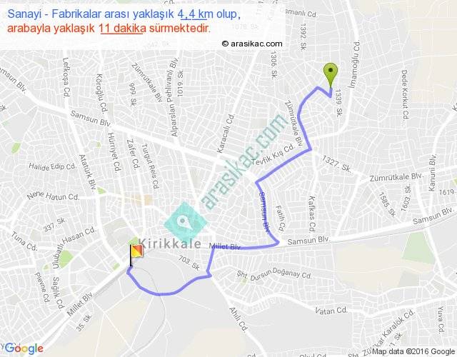 Sanayi - Fabrikalar arası yaklaşık olarak 90 km/h ile yukarıda belirtilen sürede olup, iki yerin kuş uçuşu uzaklığı (mesafesi) 3'dir. Yolculuk otobüsle 14 dakika sürmektedir.
