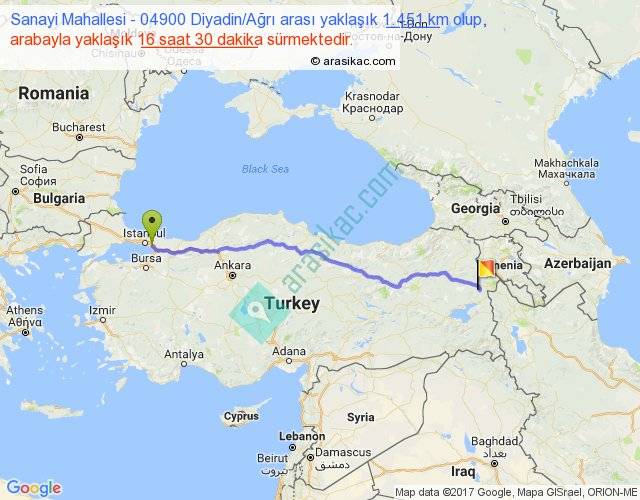 Sanayi Mahallesi - 04900 Diyadin Ağrı arası yaklaşık olarak 90 km/h ile yukarıda belirtilen sürede olup, iki yerin kuş uçuşu uzaklığı (mesafesi) 1224'dir. Eğer belirtilen yerler arasında uçak seferi var ise bu süre uçakla 1 saat 52 dakika'ya kadar düşebilir. Yolculuk otobüsle 21 saat 27 dakika sürmektedir.