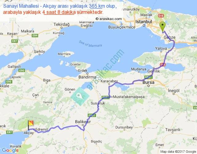 Sanayi Mahallesi - Akçay arası yaklaşık olarak 90 km/h ile yukarıda belirtilen sürede olup, iki yerin kuş uçuşu uzaklığı (mesafesi) 249'dir. Yolculuk otobüsle 5 saat 22 dakika sürmektedir.