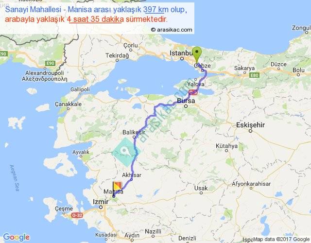 Sanayi Mahallesi - Manisa arası yaklaşık olarak 90 km/h ile yukarıda belirtilen sürede olup, iki yerin kuş uçuşu uzaklığı (mesafesi) 300'dir. Eğer belirtilen yerler arasında uçak seferi var ise bu süre uçakla 27 dakika'ya kadar düşebilir. Yolculuk otobüsle 5 saat 57 dakika sürmektedir.