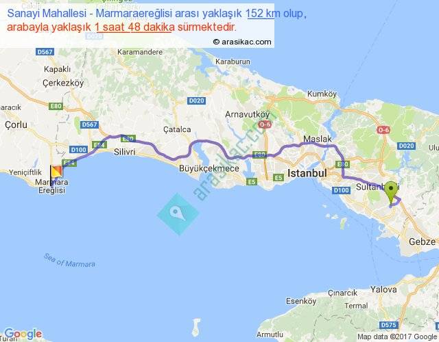 Sanayi Mahallesi - Marmaraereğlisi arası yaklaşık olarak 90 km/h ile yukarıda belirtilen sürede olup, iki yerin kuş uçuşu uzaklığı (mesafesi) 114'dir. Yolculuk otobüsle 2 saat 20 dakika sürmektedir.