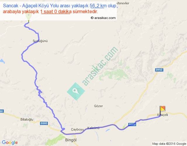 Sancak - Ağaçeli Köyü Yolu arası yaklaşık olarak 90 km/h ile yukarıda belirtilen sürede olup, iki yerin kuş uçuşu uzaklığı (mesafesi) 33'dir. Yolculuk otobüsle 1 saat 18 dakika sürmektedir.