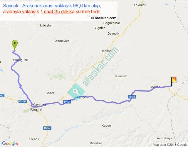Sancak - Arakonak arası yaklaşık olarak 90 km/h ile yukarıda belirtilen sürede olup, iki yerin kuş uçuşu uzaklığı (mesafesi) 65'dir. Yolculuk otobüsle 2 saat 3 dakika sürmektedir.