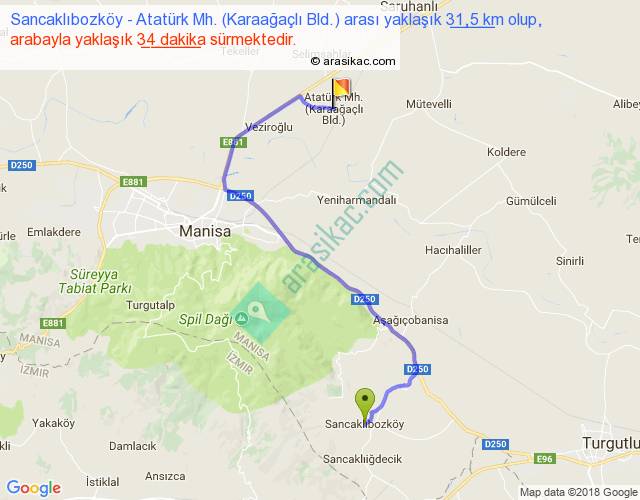 Sancaklıbozköy - Atatürk Mh. (Karaağaçlı Bld.) arası yaklaşık olarak 90 km/h ile yukarıda belirtilen sürede olup, iki yerin kuş uçuşu uzaklığı (mesafesi) 19'dir. Yolculuk otobüsle 44 dakika sürmektedir.