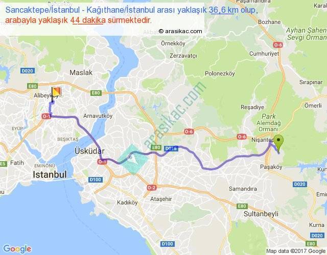 Sancaktepe İstanbul - Kağıthane İstanbul arası yaklaşık olarak 90 km/h ile yukarıda belirtilen sürede olup, iki yerin kuş uçuşu uzaklığı (mesafesi) 26'dir. Yolculuk otobüsle 53 dakika sürmektedir.