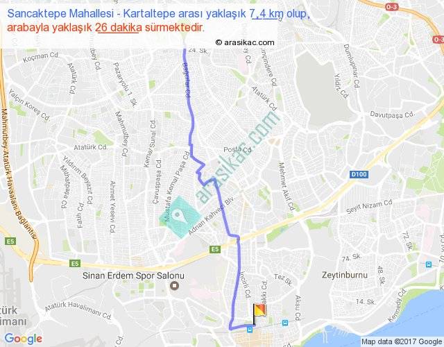 Sancaktepe Mahallesi - Kartaltepe arası yaklaşık olarak 90 km/h ile yukarıda belirtilen sürede olup, iki yerin kuş uçuşu uzaklığı (mesafesi) 6'dir. Yolculuk otobüsle 33 dakika sürmektedir.
