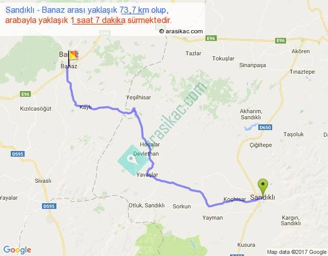 Sandıklı - Banaz arası yaklaşık olarak 90 km/h ile yukarıda belirtilen sürede olup, iki yerin kuş uçuşu uzaklığı (mesafesi) 54'dir. Yolculuk otobüsle 1 saat 27 dakika sürmektedir.