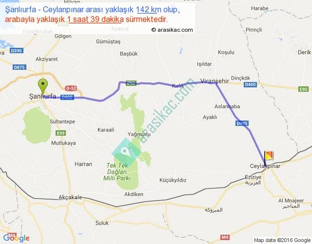 Şanlıurfa - Ceylanpınar arası yaklaşık olarak 90 km/h ile yukarıda belirtilen sürede olup, iki yerin kuş uçuşu uzaklığı (mesafesi) 116'dir. Yolculuk otobüsle 2 saat 7 dakika sürmektedir.