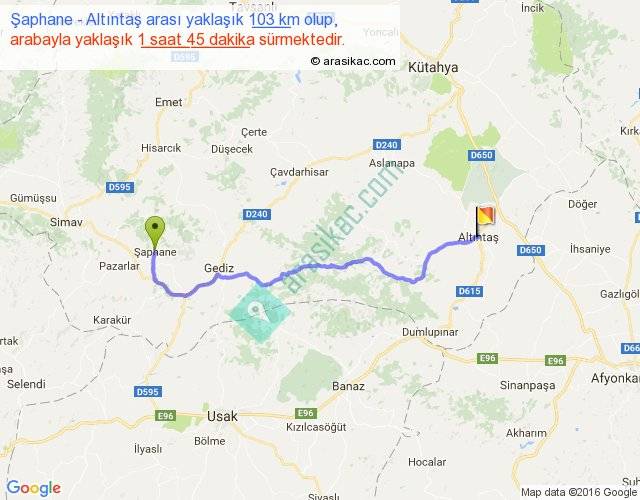 Şaphane - Altıntaş arası yaklaşık olarak 90 km/h ile yukarıda belirtilen sürede olup, iki yerin kuş uçuşu uzaklığı (mesafesi) 76'dir. Yolculuk otobüsle 2 saat 16 dakika sürmektedir.