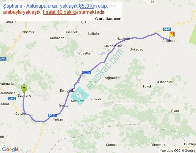 Şaphane - Aslanapa arası yaklaşık olarak 90 km/h ile yukarıda belirtilen sürede olup, iki yerin kuş uçuşu uzaklığı (mesafesi) 60'dir. Yolculuk otobüsle 1 saat 31 dakika sürmektedir.