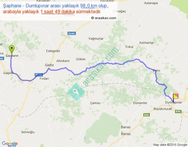 Şaphane - Dumlupınar arası yaklaşık olarak 90 km/h ile yukarıda belirtilen sürede olup, iki yerin kuş uçuşu uzaklığı (mesafesi) 68'dir. Yolculuk otobüsle 2 saat 21 dakika sürmektedir.