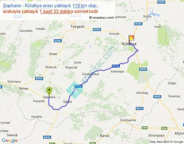 Şaphane - Kütahya arası yaklaşık olarak 90 km/h ile yukarıda belirtilen sürede olup, iki yerin kuş uçuşu uzaklığı (mesafesi) 79'dir. Yolculuk otobüsle 2 saat 0 dakika sürmektedir.