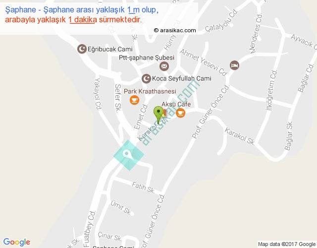 Şaphane - Şaphane arası yaklaşık olarak 90 km/h ile yukarıda belirtilen sürede olup, iki yerin kuş uçuşu uzaklığı (mesafesi) 0'dir. Yolculuk otobüsle 1 dakika sürmektedir.