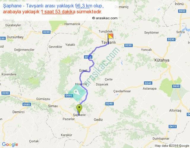 Şaphane - Tavşanlı arası yaklaşık olarak 90 km/h ile yukarıda belirtilen sürede olup, iki yerin kuş uçuşu uzaklığı (mesafesi) 62'dir. Yolculuk otobüsle 2 saat 26 dakika sürmektedir.