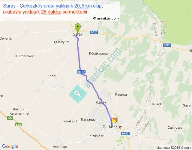 Saray - Çerkezköy arası yaklaşık olarak 90 km/h ile yukarıda belirtilen sürede olup, iki yerin kuş uçuşu uzaklığı (mesafesi) 19'dir. Yolculuk otobüsle 36 dakika sürmektedir.