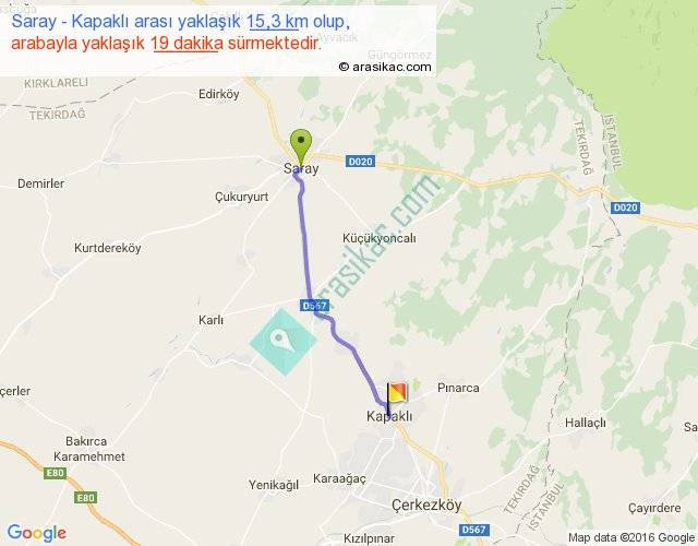 Saray - Kapaklı arası yaklaşık olarak 90 km/h ile yukarıda belirtilen sürede olup, iki yerin kuş uçuşu uzaklığı (mesafesi) 14'dir. Yolculuk otobüsle 24 dakika sürmektedir.