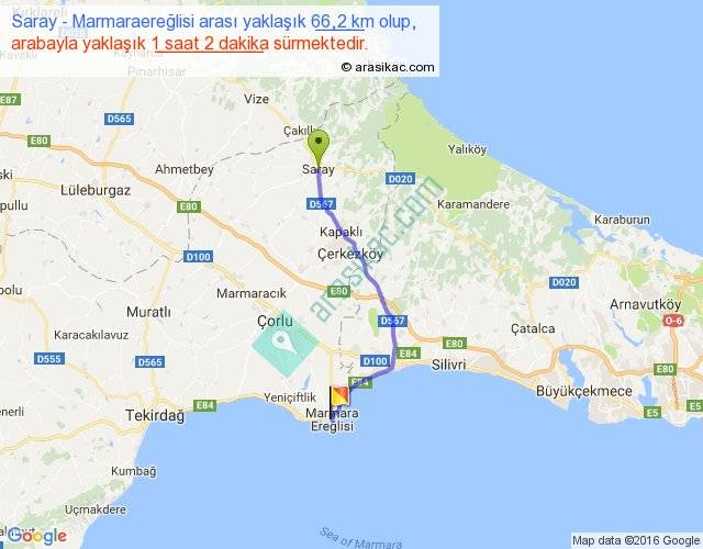 Saray - Marmaraereğlisi arası yaklaşık olarak 90 km/h ile yukarıda belirtilen sürede olup, iki yerin kuş uçuşu uzaklığı (mesafesi) 52'dir. Yolculuk otobüsle 1 saat 20 dakika sürmektedir.