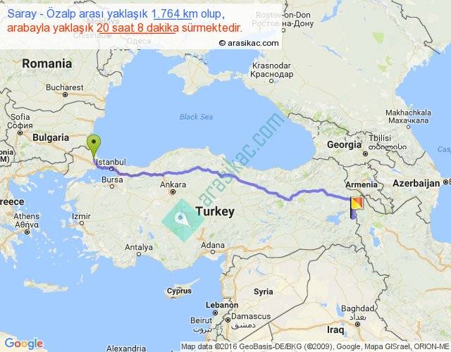 Saray - Özalp arası yaklaşık olarak 90 km/h ile yukarıda belirtilen sürede olup, iki yerin kuş uçuşu uzaklığı (mesafesi) 1392'dir. Eğer belirtilen yerler arasında uçak seferi var ise bu süre uçakla 2 saat 08 dakika'ya kadar düşebilir. Yolculuk otobüsle 1 gün 2 saat sürmektedir.