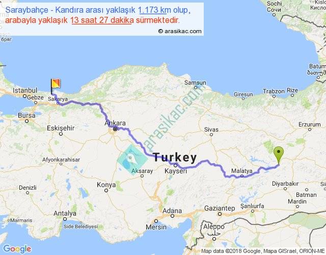 Saraybahçe - Kandıra arası yaklaşık olarak 90 km/h ile yukarıda belirtilen sürede olup, iki yerin kuş uçuşu uzaklığı (mesafesi) 867'dir. Eğer belirtilen yerler arasında uçak seferi var ise bu süre uçakla 1 saat 20 dakika'ya kadar düşebilir. Yolculuk otobüsle 17 saat 29 dakika sürmektedir.