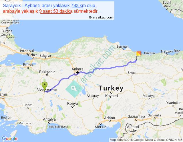 Saraycık - Aybastı arası yaklaşık olarak 90 km/h ile yukarıda belirtilen sürede olup, iki yerin kuş uçuşu uzaklığı (mesafesi) 636'dir. Eğer belirtilen yerler arasında uçak seferi var ise bu süre uçakla 58 dakika'ya kadar düşebilir. Yolculuk otobüsle 12 saat 50 dakika sürmektedir.